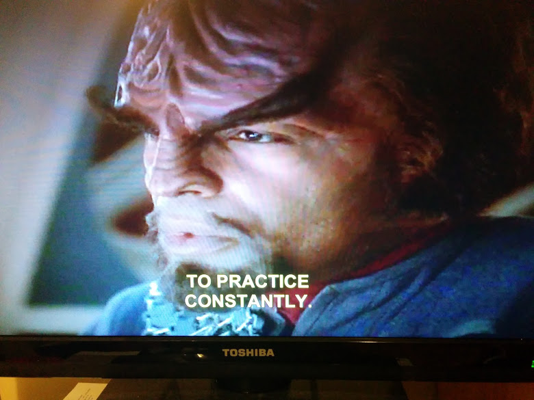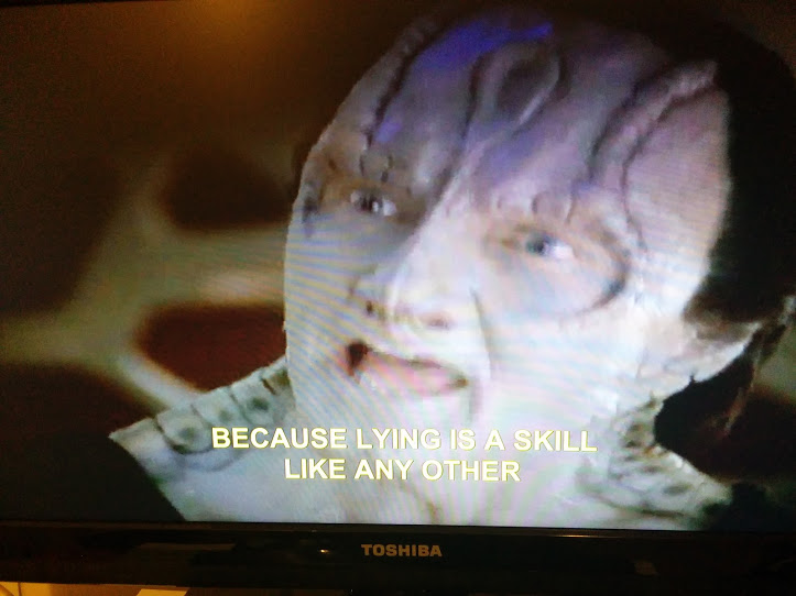 Andrew Robinson (aka Mr. Garak) explains the art of lying to Mr. Worf. And the need to stay in practise. (Star Trek Deep Space Nine, Paramount Pictures)