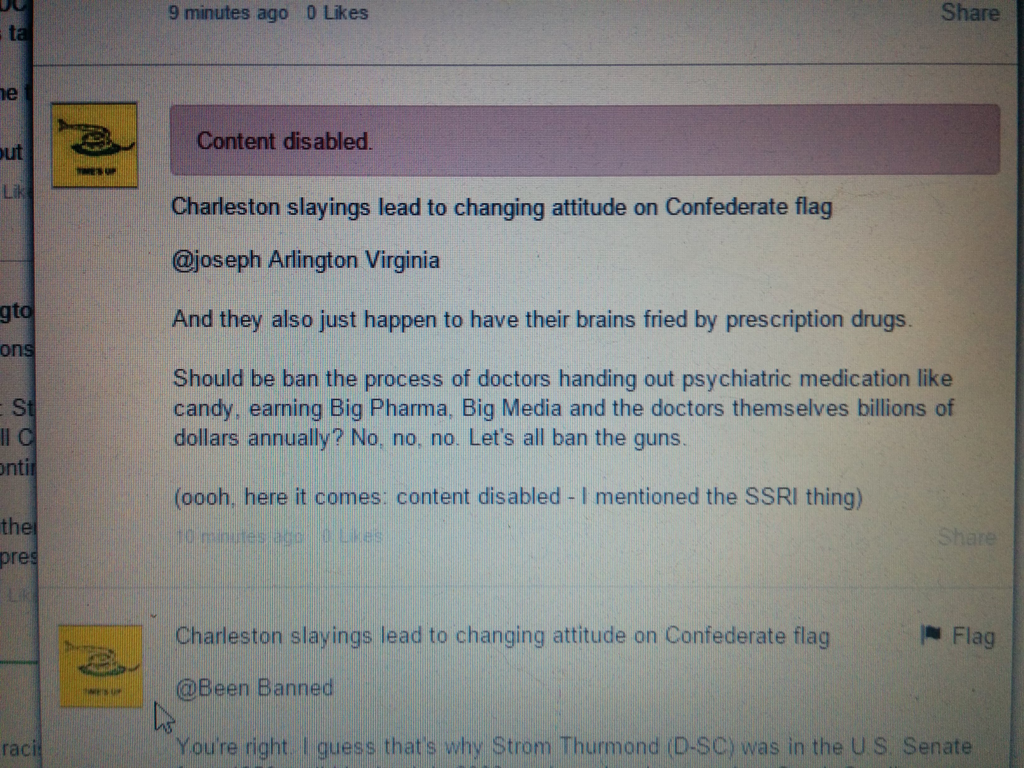 Charleston slayings lead to changing attitude on Confederate flag @joseph Arlington Virginia And they also just happen to have their brains fried by prescription drugs. Should be ban the process of doctors handing out psychiatric medication like candy, earning Big Pharma, Big Media and the doctors themselves billions of dollars annually? No, no, no. Let’s all ban the guns. (oooh, here it comes: content disabled – I mentioned the SSRI thing)