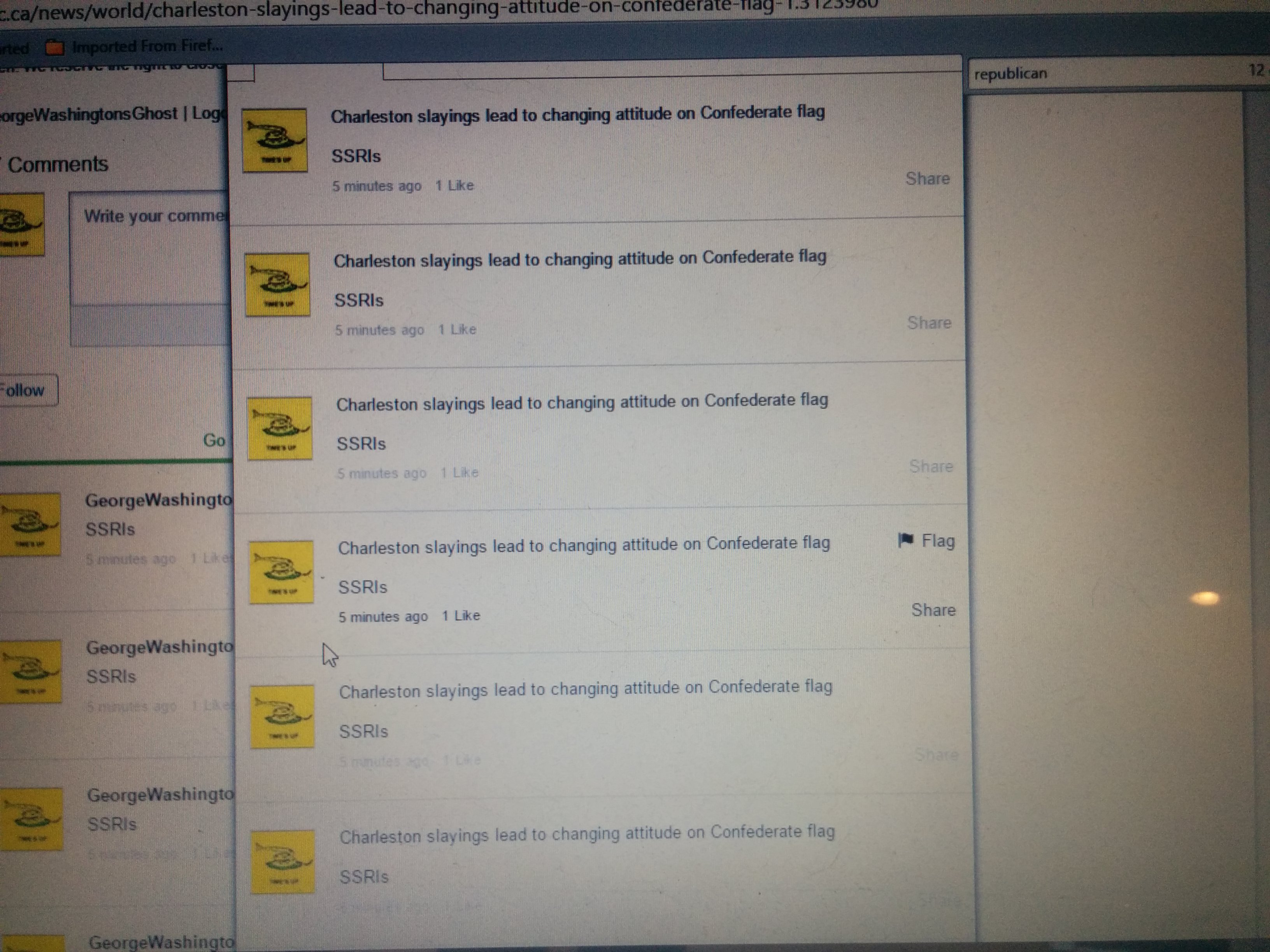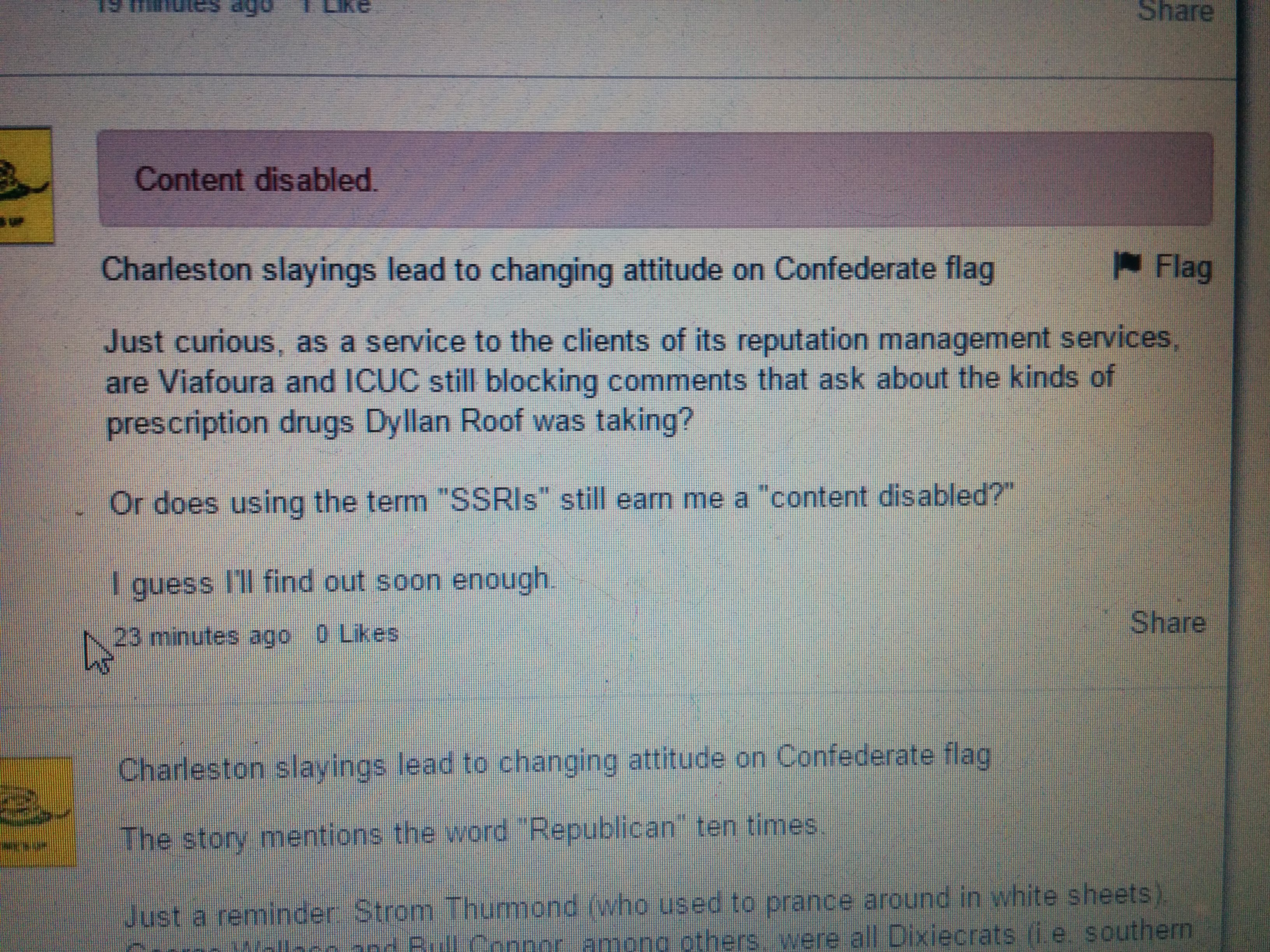 Charleston slayings lead to changing attitude on Confederate flag Just curious, as a service to the clients of its reputation management services, are Viafoura and ICUC still blocking comments that ask about the kinds of prescription drugs Dyllan Roof was taking? Or does using the term “SSRIs” still earn me a “content disabled?” I guess I’ll find out soon enough.