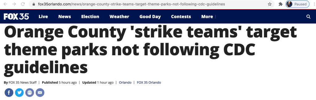 The Orange County strike teams will start doing surprise checks at area theme parks. This is a county-wide effort going on for several weeks now.