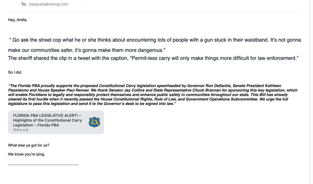 Appearing on Orlando’s Fox affiliate, WOFL, channel 35, Frost offered the usual assurance that “I’m not gonna grab your guns.”